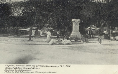 I didn't give much thought to what had happened in between, such as when was the repair done and how it was accomplished, until, while browsing through Father Francis X. Delaney's History of the Catholic Church in Jamaica, B.W.I., 1494 to 1929 (New York: Jesuit Mission Press, 1930) I came across the story behind the repair of the statue. On page 256, Father Delaney writes: